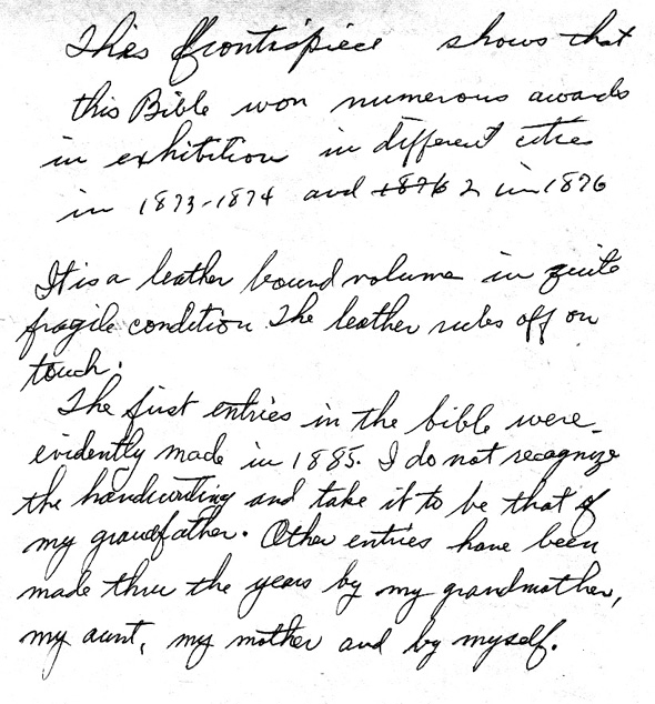 The images shown are from the William Freienmuth Family Bible, currently in possession of William Leland Freienmuth. One page shows the names and dates that are included. The other pages shows the description of the bible. The notes were written by Willam Hans Freienmuth, Leland's father.