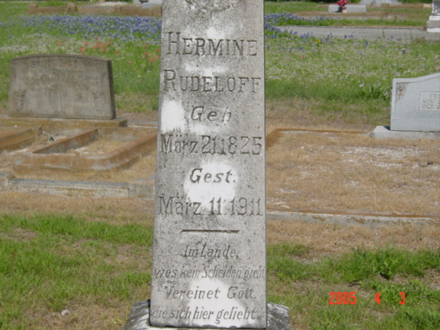 Hermine "Minnie" Schumann Rudeloff, wife of Friedrich Rudeloff, Schumannsville Cemetery, Schumannsville, Texas. Thanks for permission from Find A Grave contributor liz & lee to use this photo. Click on photo to enlarge it. |