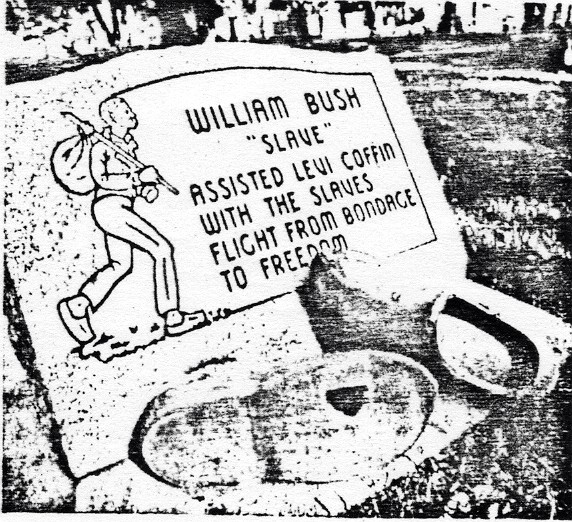 Among the runaways assisted was William Bush, who reached Coffin's house wearing wooden shoes he had carved for himself. Settling in Newport, Bush became a conductor for other runaways while following the blacksmith's trade. He won the town's gratitude when during an epidemic he dared to bury the dead. His grave was marked recently by a descendant (right). (Click on the picture for a larger image.)