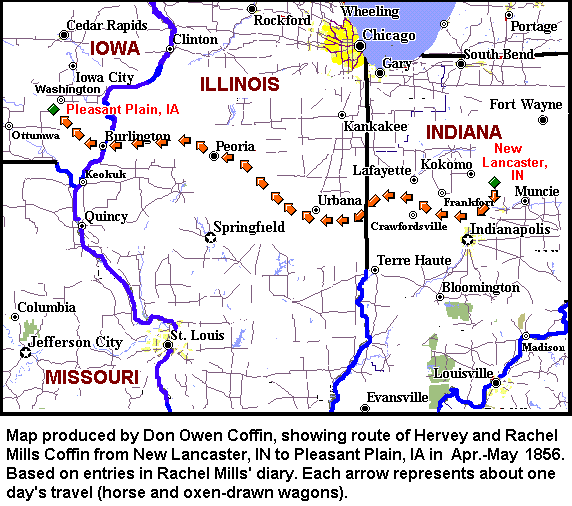 Rachel Mills, her husband, Hervey Coffin, and family left their home in New Lancaster, Madison County, Indiana, April 14, 1856 and arrived at Pleasant Plain, Iowa, May 12, 1856, a distance of 386 miles, having been four weeks on the road. They had loaded their household goods into two schooner wagons, one drawn by a team of horses and the other by 3 or 4 yoke of oxen and drove some other stock along. Rachel kept a diary of their trip; excerpts are below. My thanks go out to Lynn Reynolds for a more complete copy of the diary. Her copy came from the late Ruth Wicks of Adel, Iowa who descends from Jeremiah Mills, Jr.