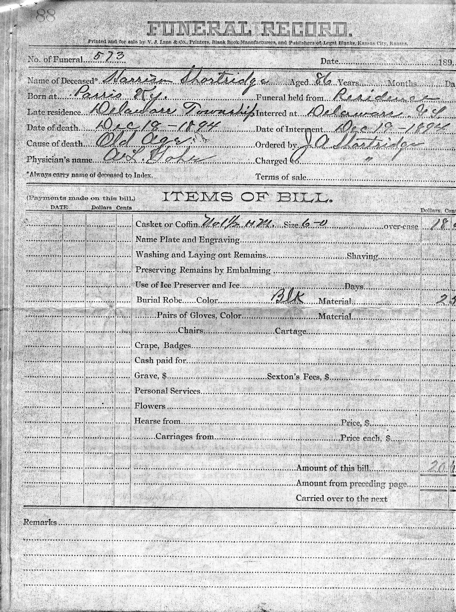 The Funeral Bill for Harrison Shortridge.